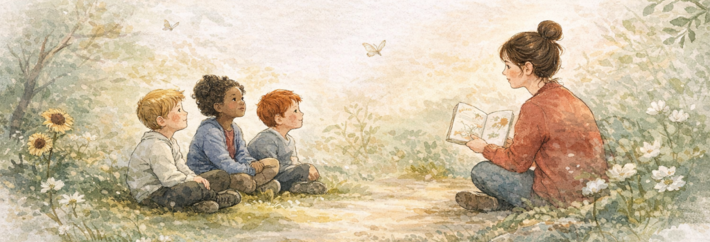 A more interactive session where children explore storytelling using objects and prompts.